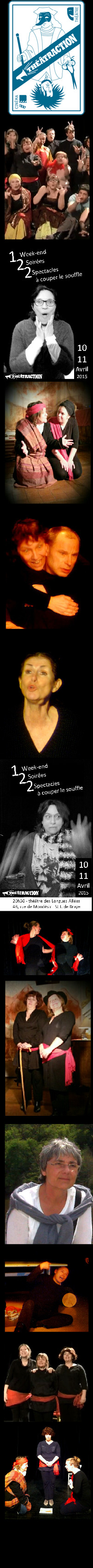 pour nous et pour le public.Au travers de nos 2 séances sur le Week-end du 10 & 11 avril 2015, nous essayerons de partager avec le public. Attention, comme la jauge du Théâtre des Longues Allées est de 70 places, il est conseillé de réserver par mail.